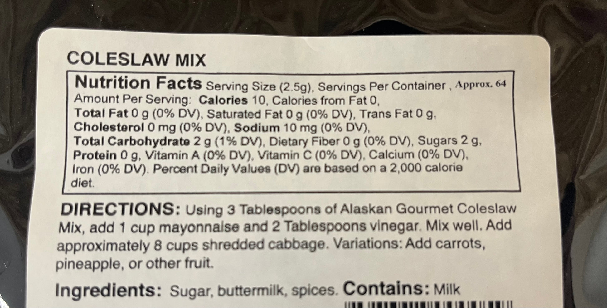 This bag of mix will prepare four large batches of coleslaw. It is packaged in a resealable bag for convenient storage and use. It is simple to prepare. Add your favorites to the mix, carrots, celery, or other fresh vegetables and, if you prefer a sweeter “slaw, add some crushed pineapple.